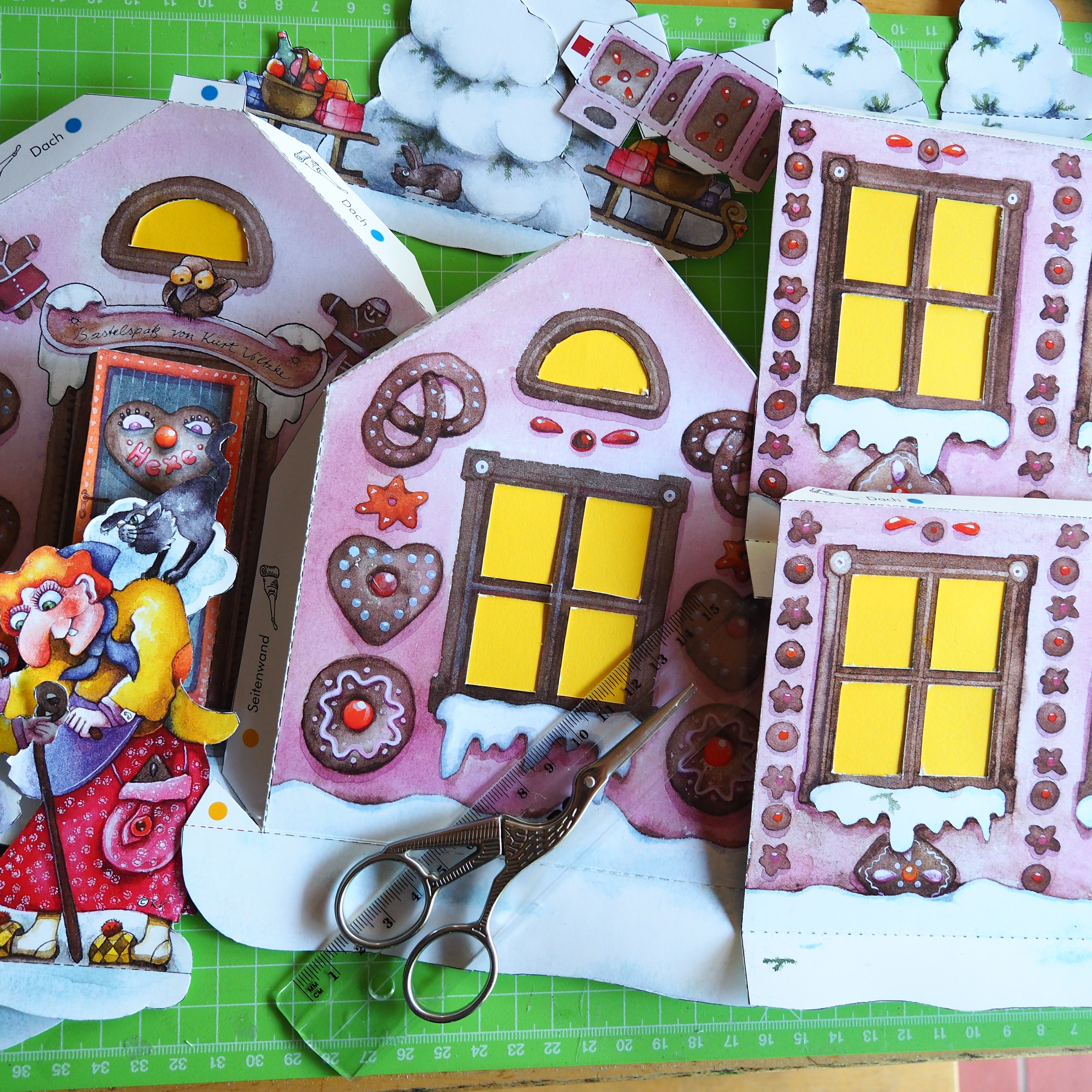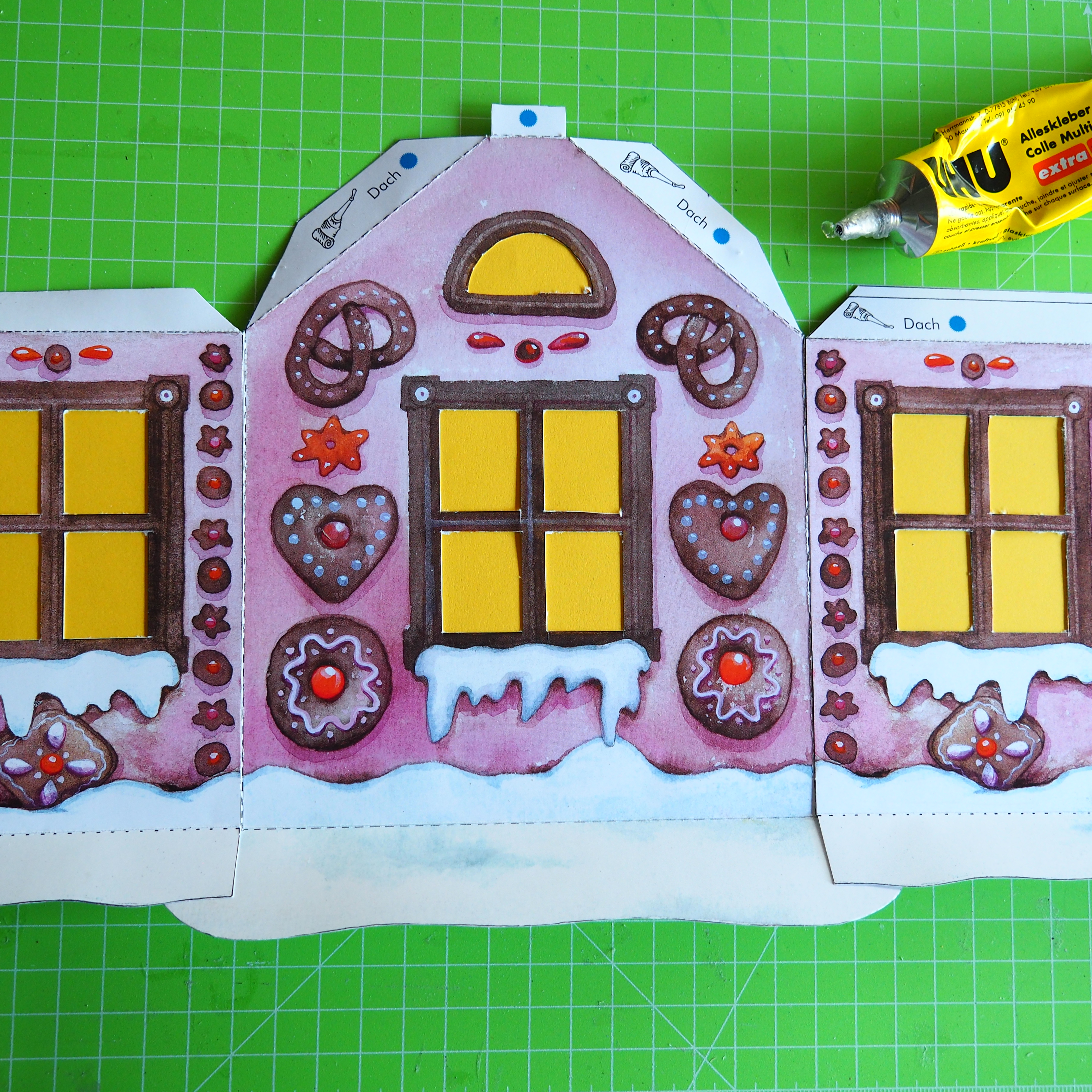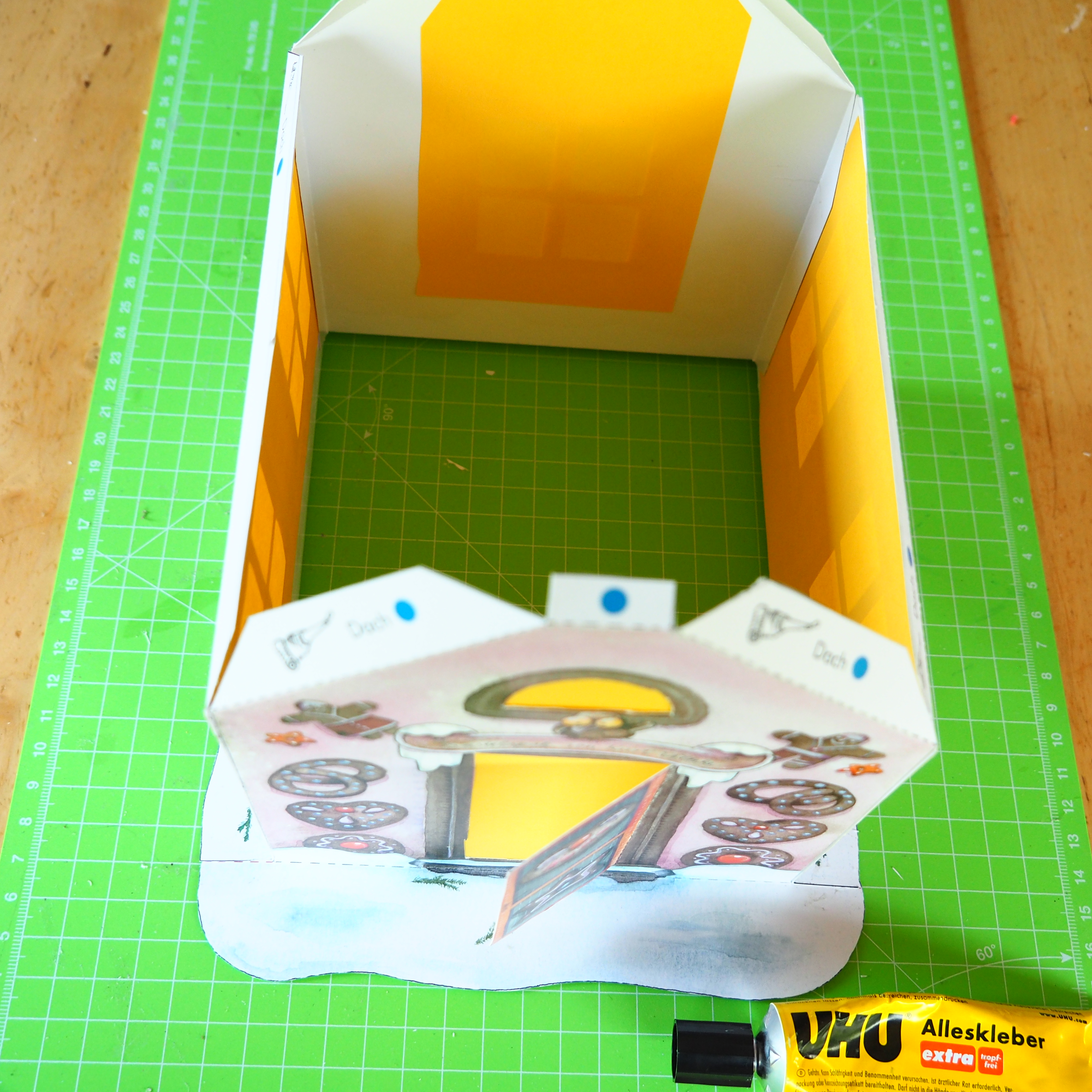 Zuerst alle Teile an der schwarzen Linie Ausschneiden. Fenster und Tür öffnen und mit gelben Papier hinterkleben. Gestrichelte Linien sorgfältig mit der Scherenspitze und Lineal ritzen und falzen. Danach Montieren siehe Anleitung.
