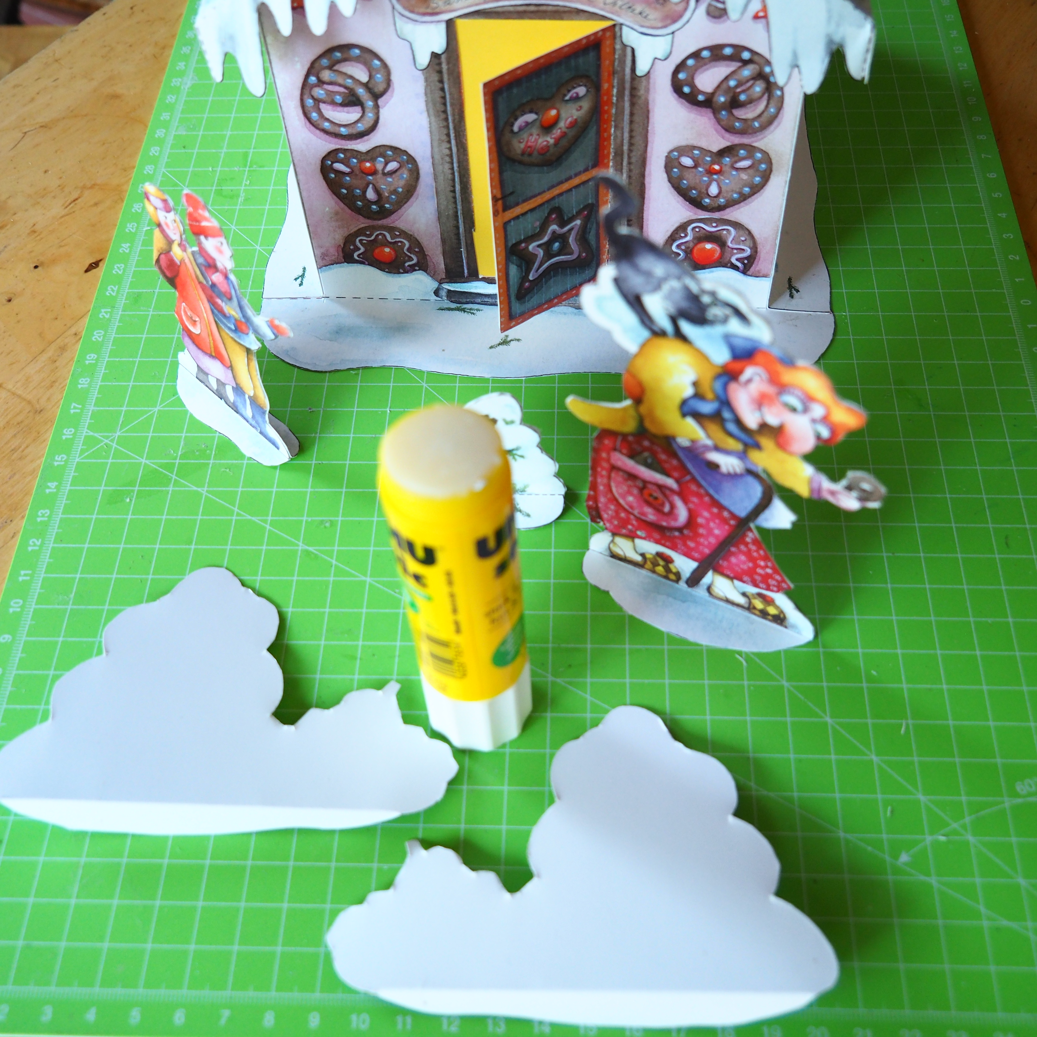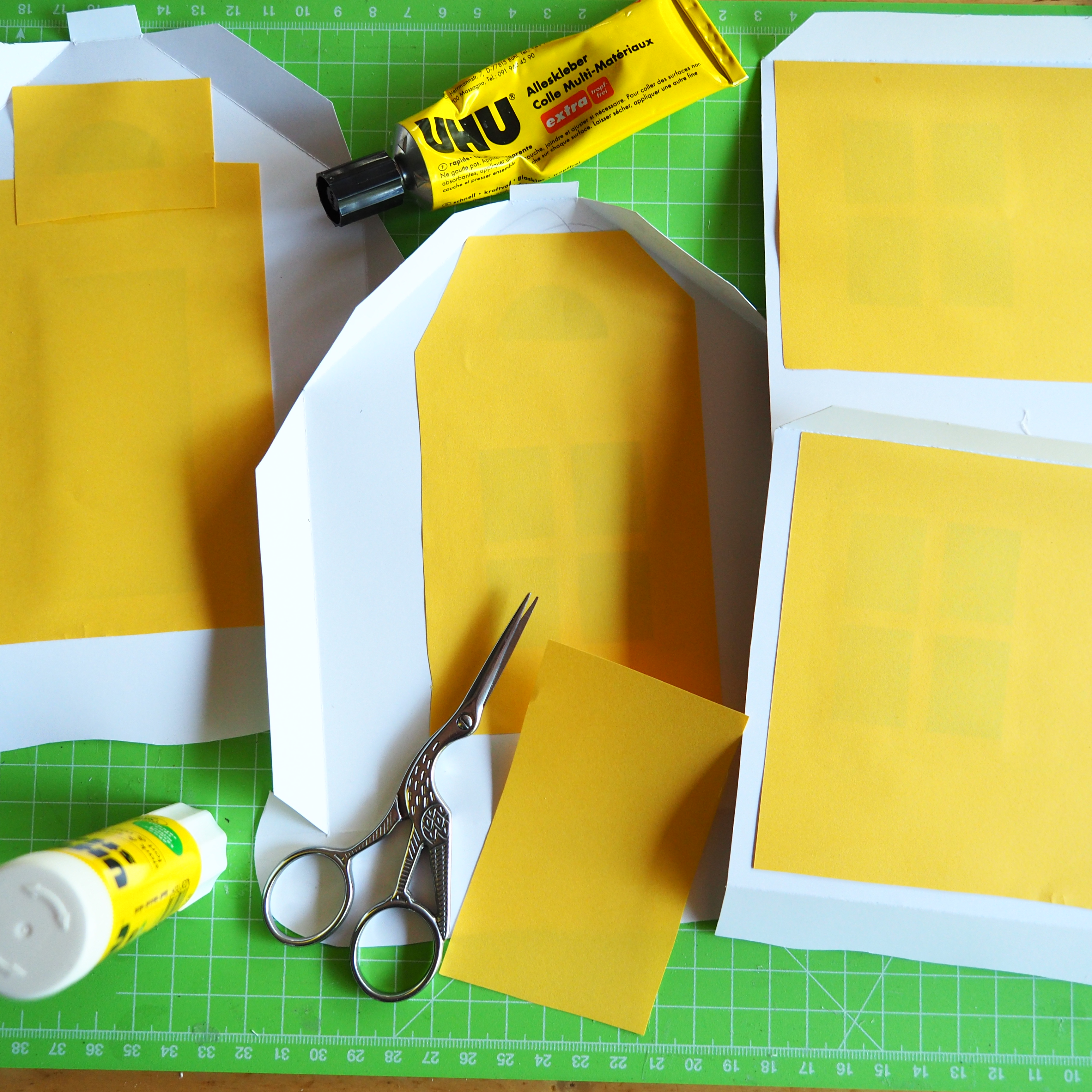 Leimempfehlung: Uhu Klebestift und Uhu Alleskleber für kleine Flächen. Weiteres Bastelzubehör: Kleine Schere mit Spitze, Lineal, Bastelunterlage, Wäscheklammern